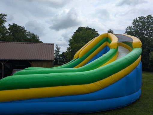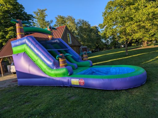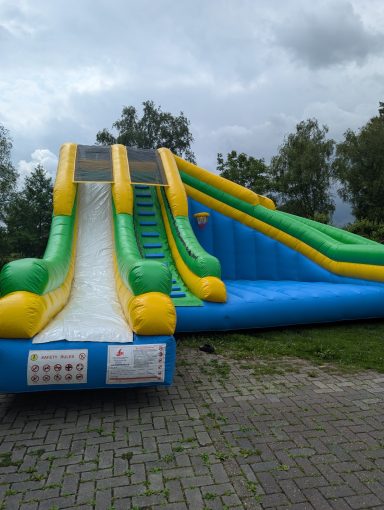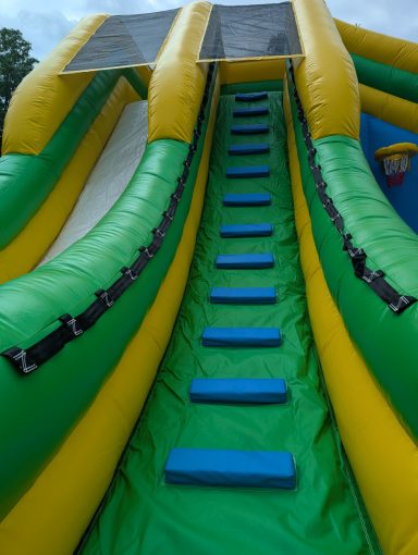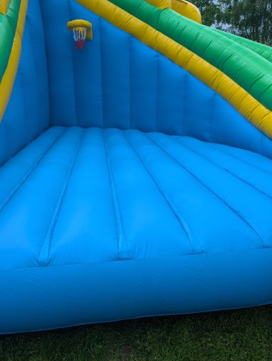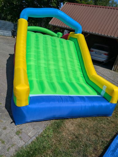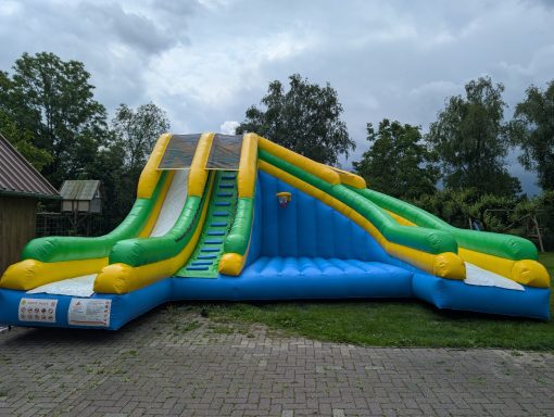 Diese Hüpfburg besteht aus einer graden Rutsche und eine langgezogene Kurve, sowie eine zusätzliche große Hüpffläche zwischen den beiden Rutschen und einem Basketballkorb. Die Hüpfburg muss mit einem Anhänger transportiert werden.