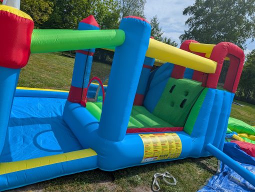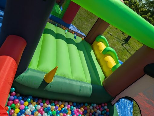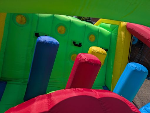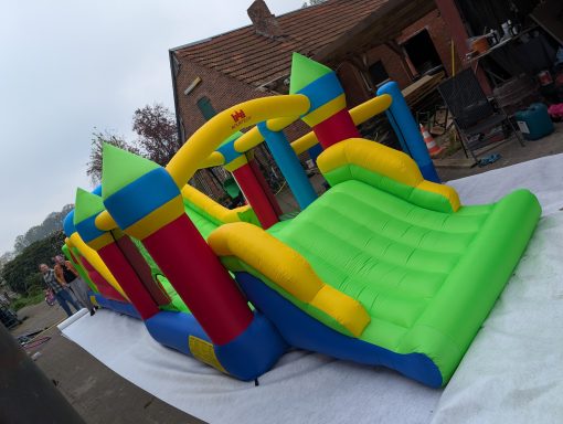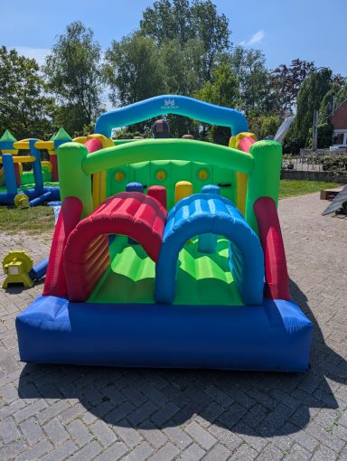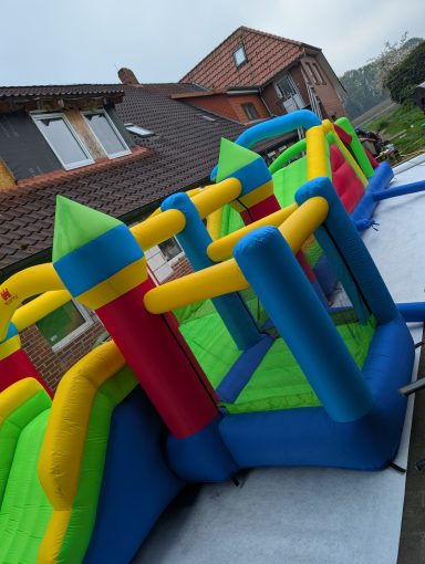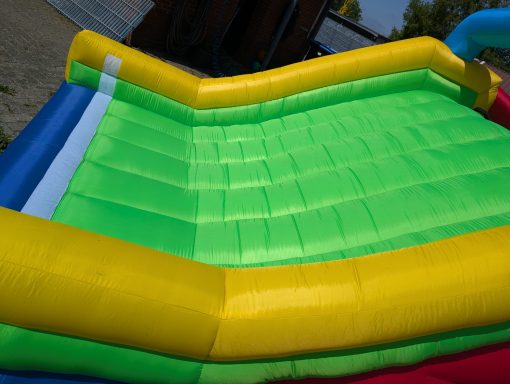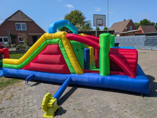 Diese Hüpfburg ist ein Hindernisparcours mit Sprungfläche die Separat gestellt werden kann oder auch einzeln gemietet. Auch hier ist die Sprungfläche mit einem Netz gesichert. Der Parkour endet mit einer großen Rutsche.